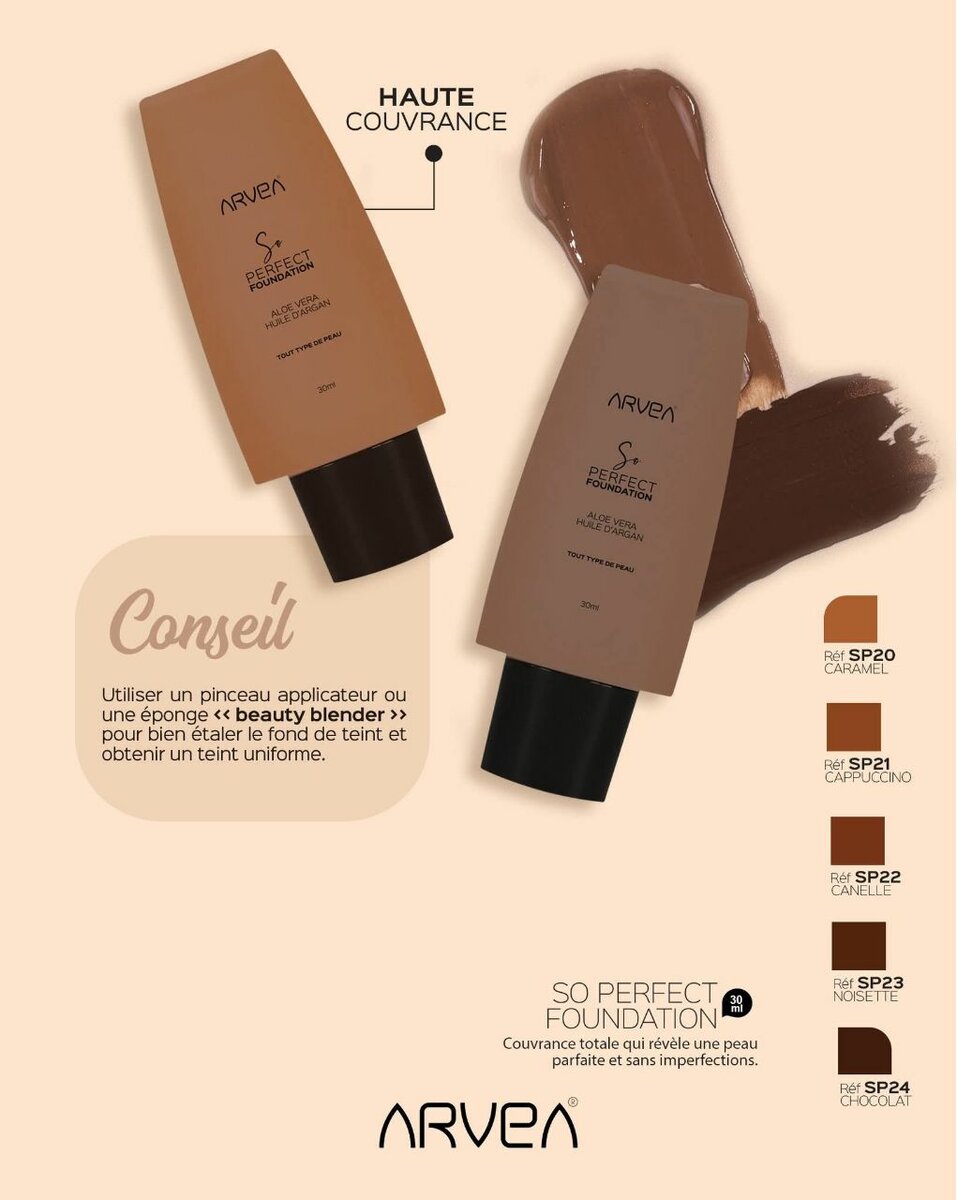 Fond de teint Arvea pour une peau parfaite et uniforme, disponible en plusieurs teintes, facile à appliquer avec pinceau ou éponge. Idéal pour cacher les imperfections quotidiennes.
