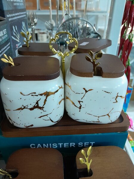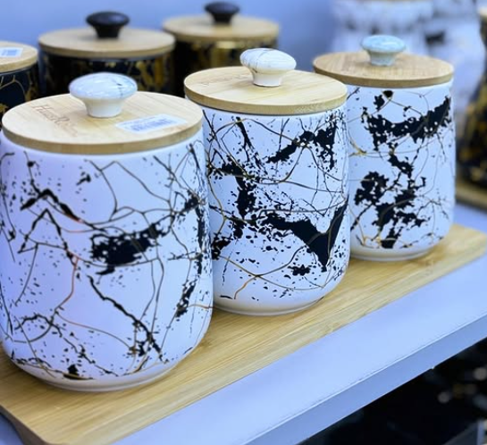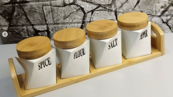 из трех керамических банок, бамбуковых крышек и бамбуковая подставка которая не боится воды 👌