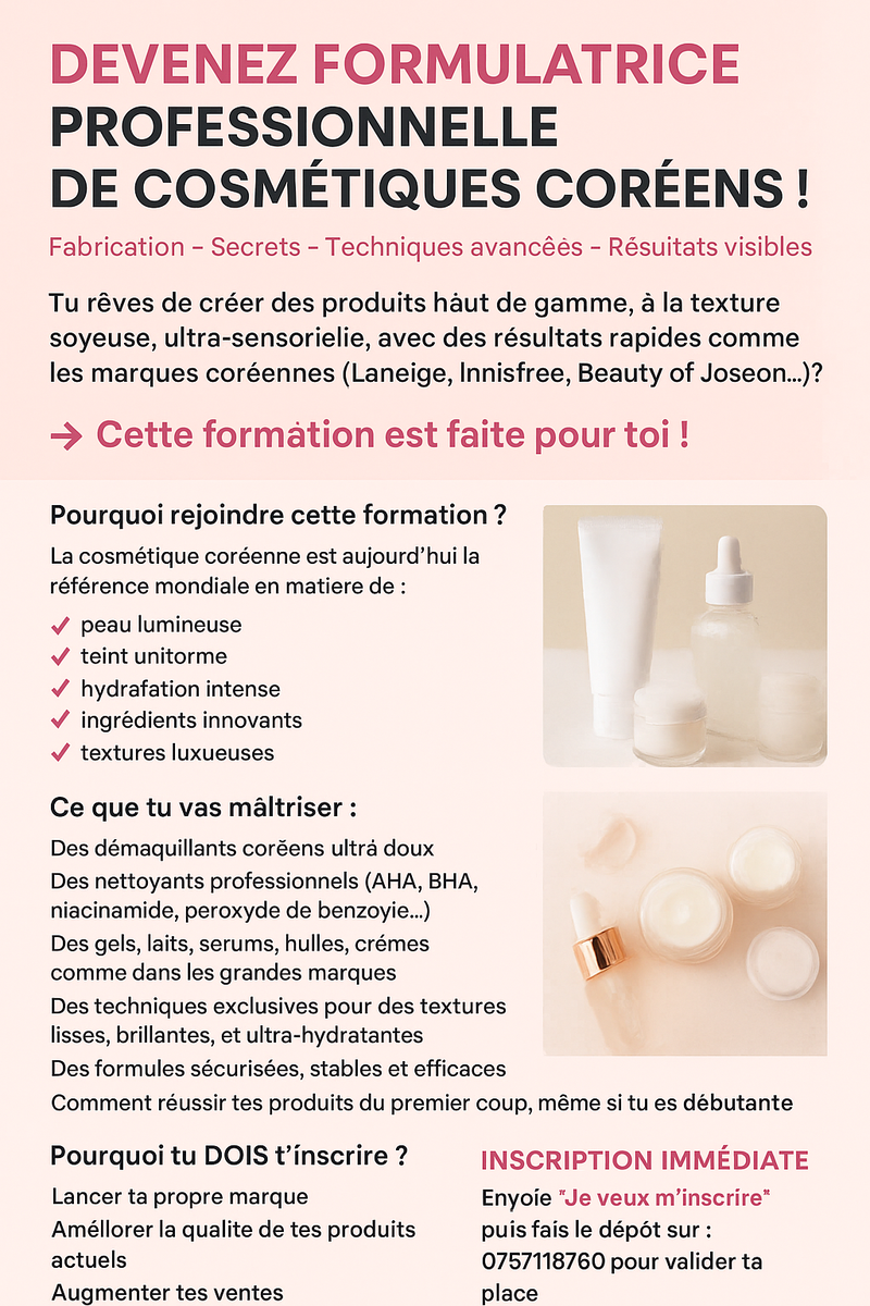 Apprenez à créer des produits haut de gamme : sérums, crèmes, nettoyants, textures brillantes et hydratantes comme les grandes marques coréennes !