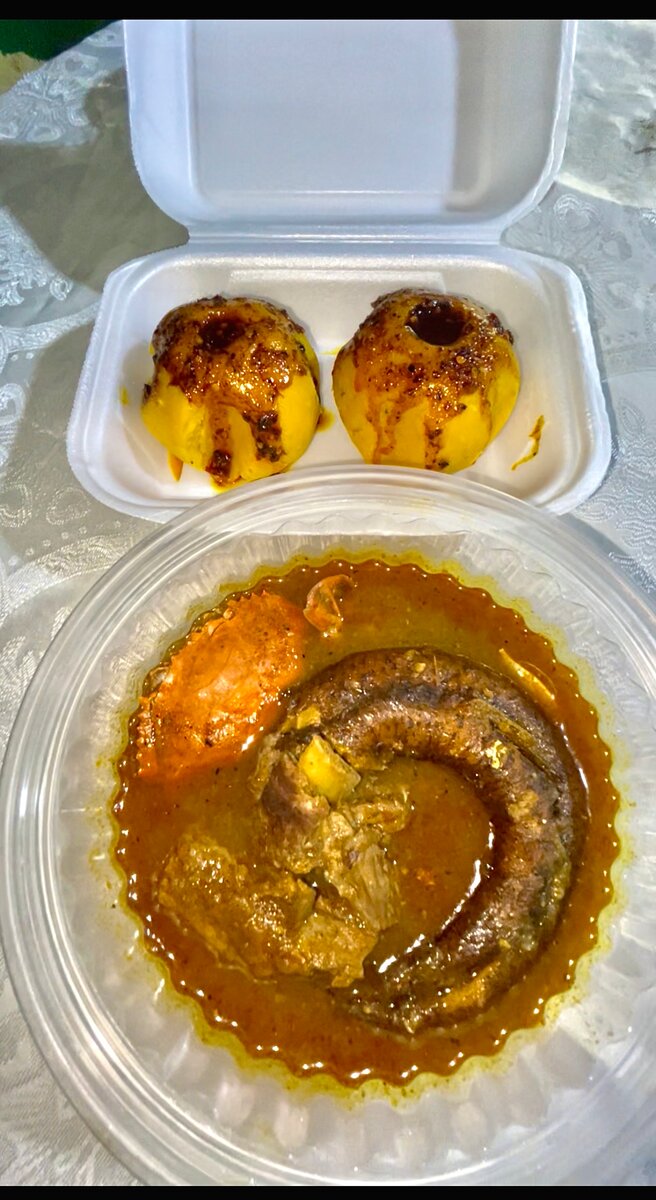 Plat de foufou cuisiné suivant les recettes culinaires Ébrié. Composition: Crabe, viandes, poisson fumé