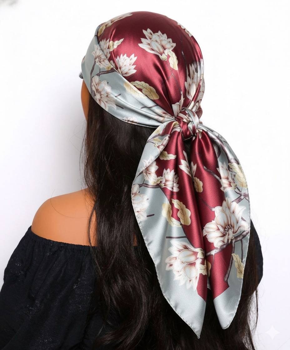 Élégant foulard en satin avec motifs floraux, idéal pour ajouter une touche chic à votre tenue. Conçu pour être porté comme accessoire de tête ou écharpe légère. Parfait pour toutes les saisons et occasions.