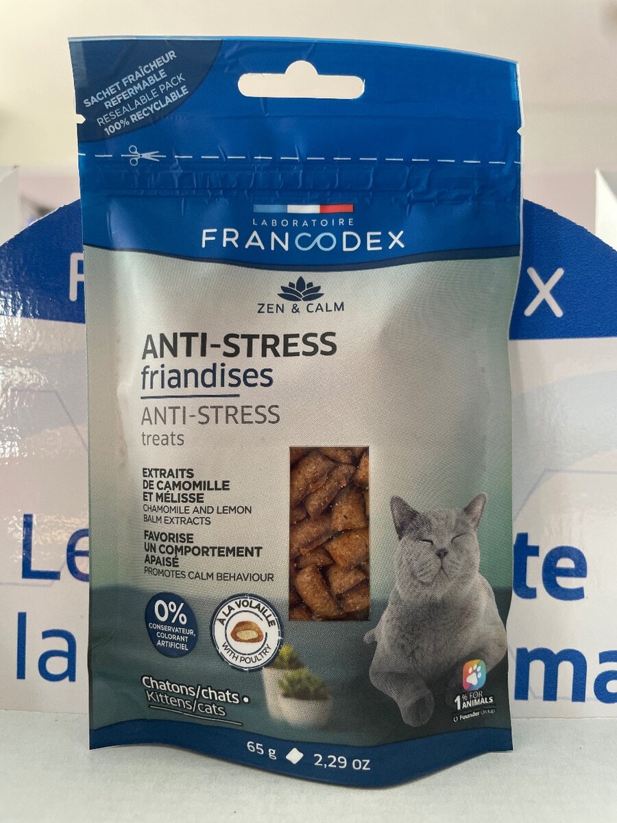 Les friandises anti-stress contiennent un mélange de magnésium et d´extraits de plantes (camomille,mélisse ) qui aide le chat à s´adapter aux situations stressantes
