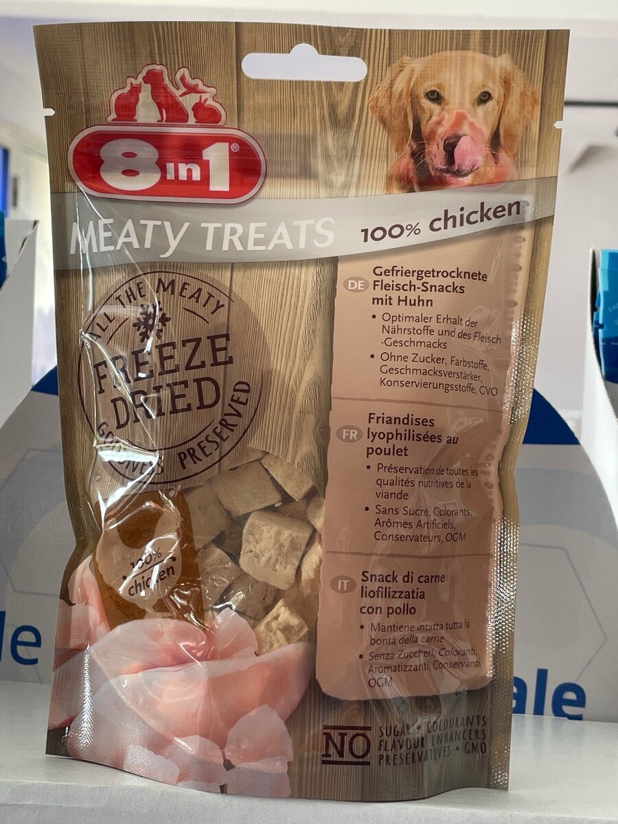 Les 8in1 friandises lyophilisées à la viande renferment toutes les quantités nutritives s et la saveur de la poitrine de poulet pour le plus grand delivce de votre chien