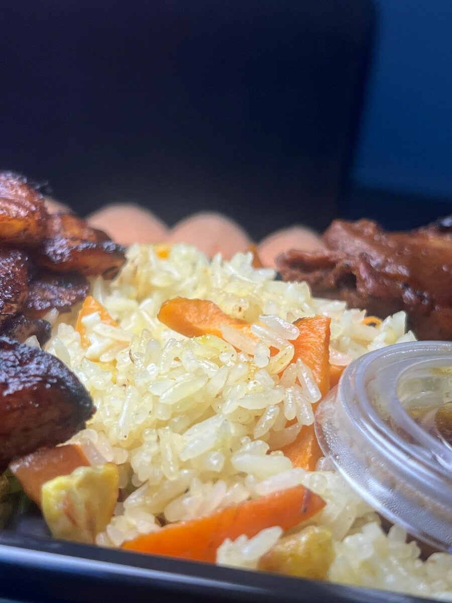 Rice mixed with Vegetables and egg. Topped with Plantain and chicken