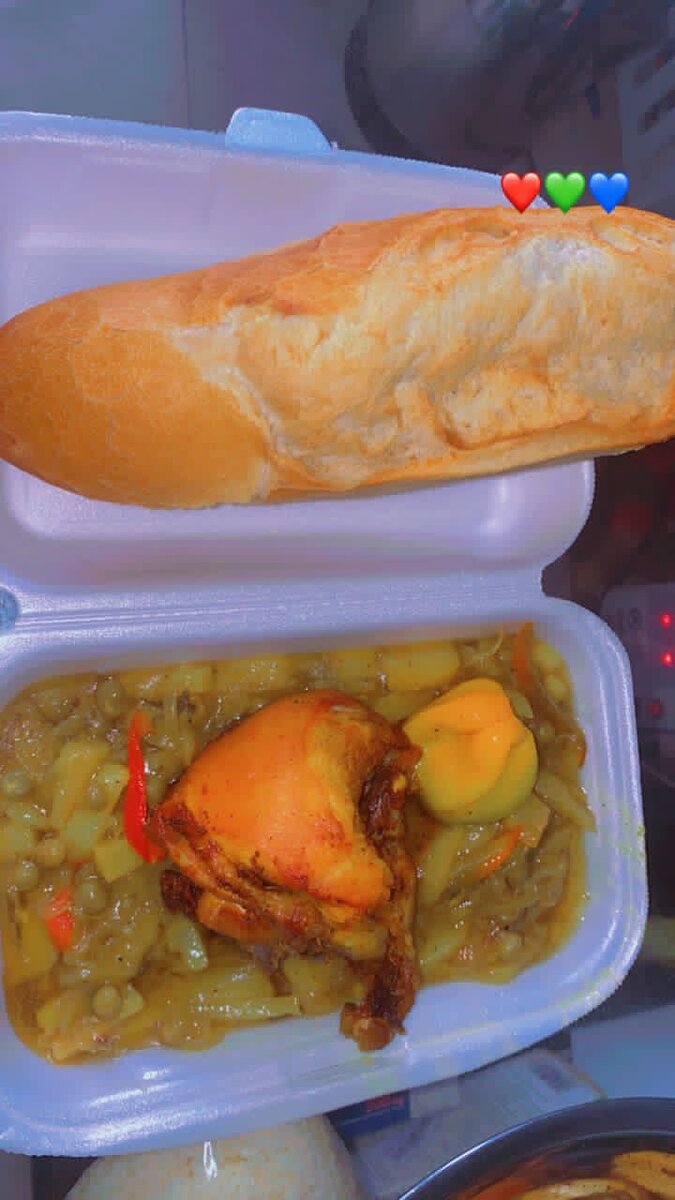 Savourez la délicieuse combinaison de frite petit pois et du poulet et de légumes mijotés, parfait pour un repas réconfortant à emporter. Accompagné de pain croustillant, cette option pratique offre une explosion de saveurs et de textures. Idéal pour un déjeuner rapide ou un dîner nourrissant.