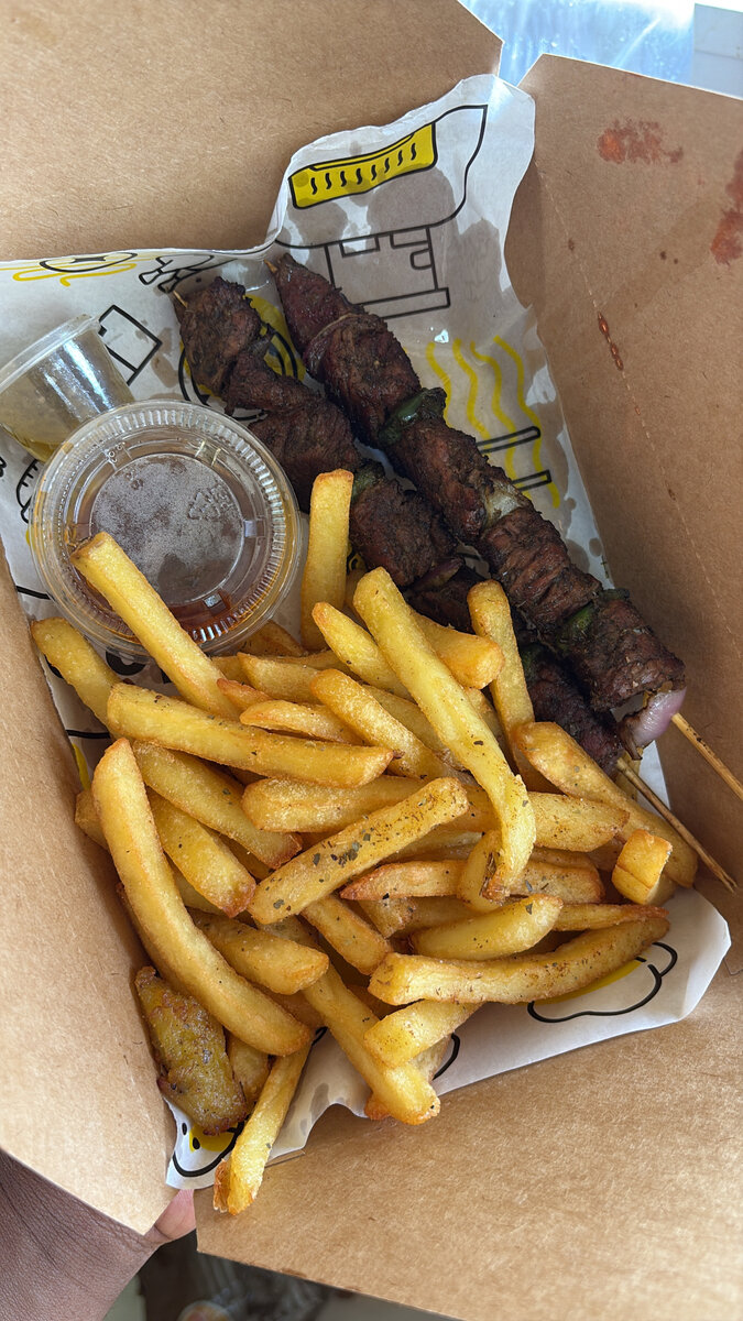 Savor the taste of juicy grilled skewers paired with crispy, golden fries. Perfect for a quick lunch or dinner treat. Enjoy the flavorful experience!