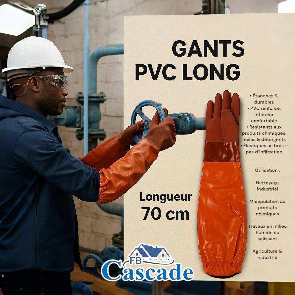 Gants de protection en PVC long 70 cm, idéaux pour les environnements industriels. Imperméables et résistants aux produits chimiques, ils sont parfaits pour le nettoyage et la manutention en milieu humide.