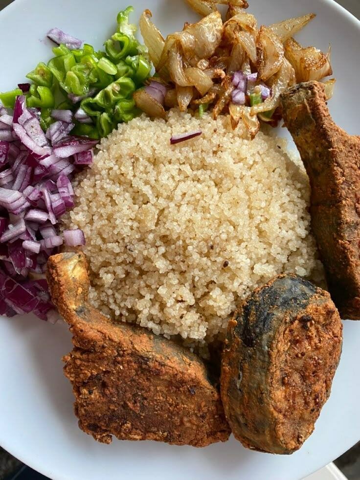 Savourez ce délicieux plat de couscous avec du poisson frit, des légumes frais et des oignons caramélisés. Parfait pour un repas familial convivial et exotique.