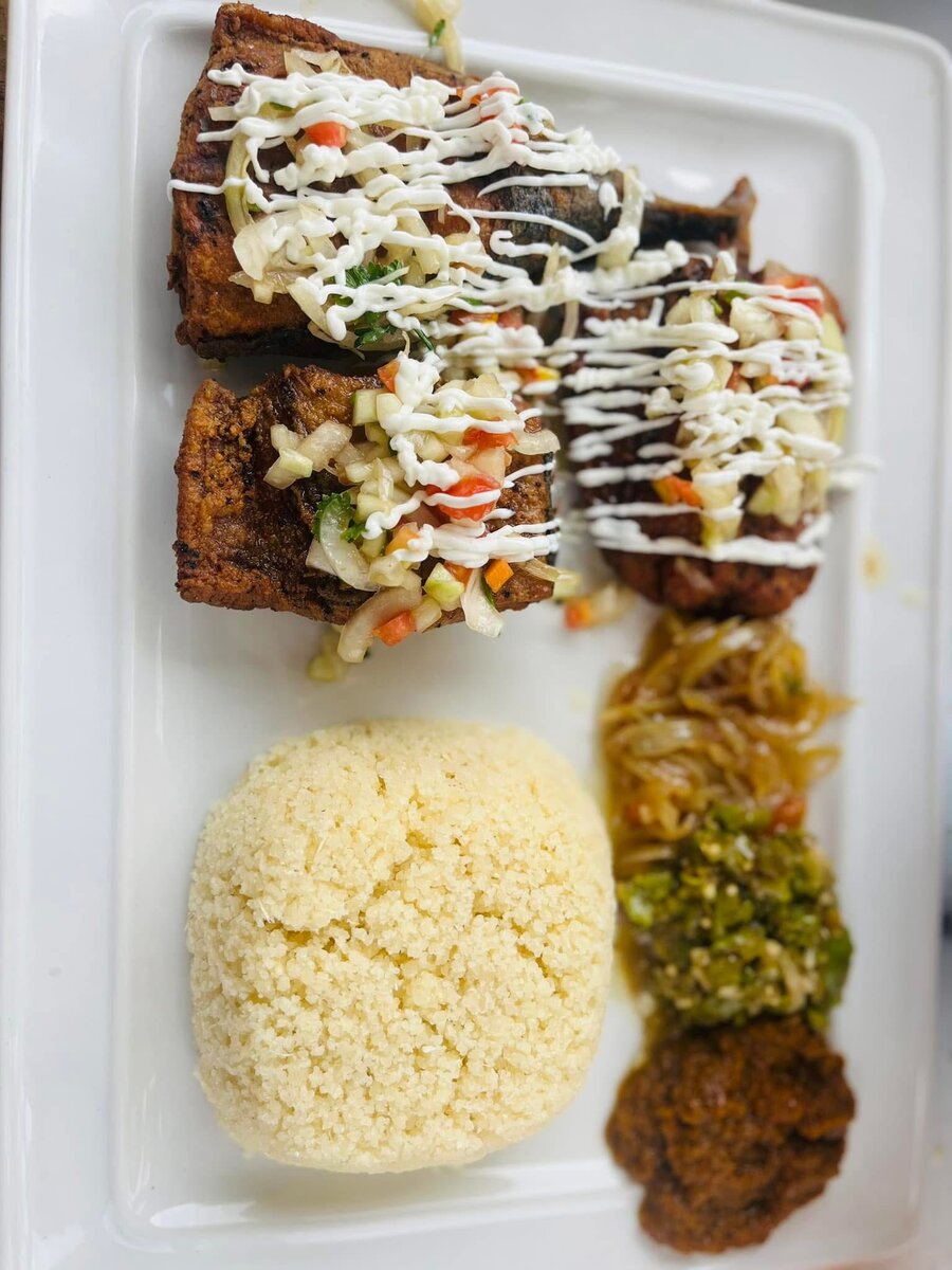 garba ivoire poisson grillé garni de légumes frais, accompagné de couscous léger et de savoureuses garnitures épicées. Parfait pour un repas équilibré et exotique!
