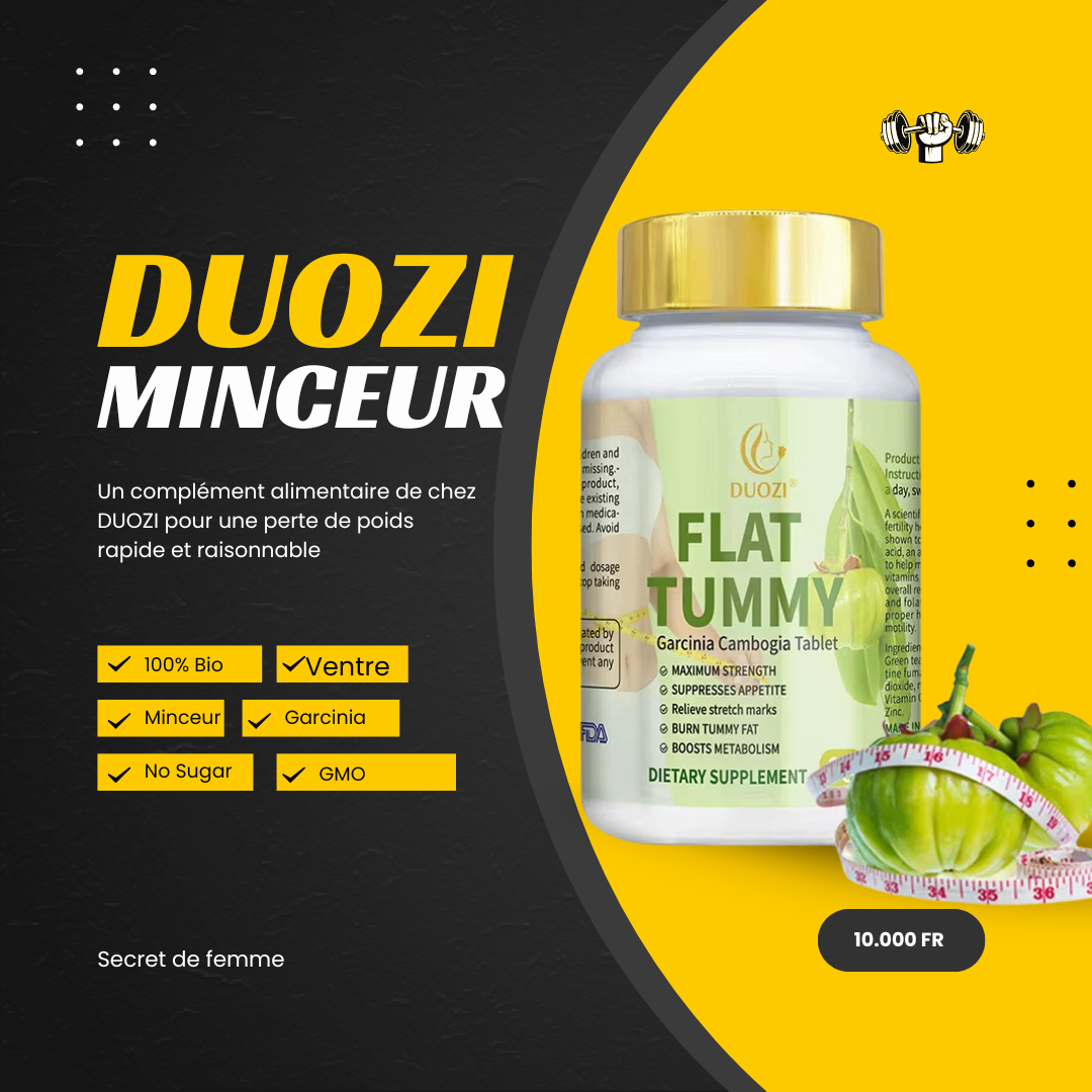 Maximisez votre perte de poids avec Duozi Flat Tummy. Ces comprimés sont formulés pour supprimer l'appétit et booster votre métabolisme tout en réduisant les graisses du ventre. Un complément parfait pour une silhouette affinée et tonifiée. Idéal pour ceux cherchant un soutien naturel dans leur parcours minceur. Prenez le contrôle de votre santé dès aujourd'hui!
