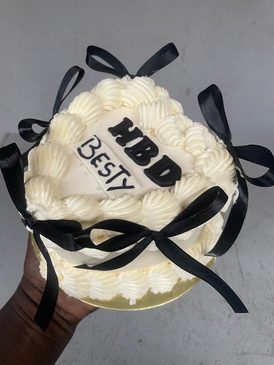 Célébrez chaque instant spécial avec ce magnifique gâteau décoratif, parfait pour les fêtes et anniversaires. Conception élégante avec des rubans noirs, ajoutant une touche chic à votre événement. Idéal comme pièce maîtresse pour surprendre vos amis et proches.