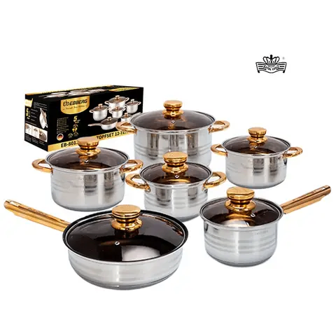 12pieces German stainless steel, mirror polished, 5 bottom layers. Does not burn, easy to use easy to clean