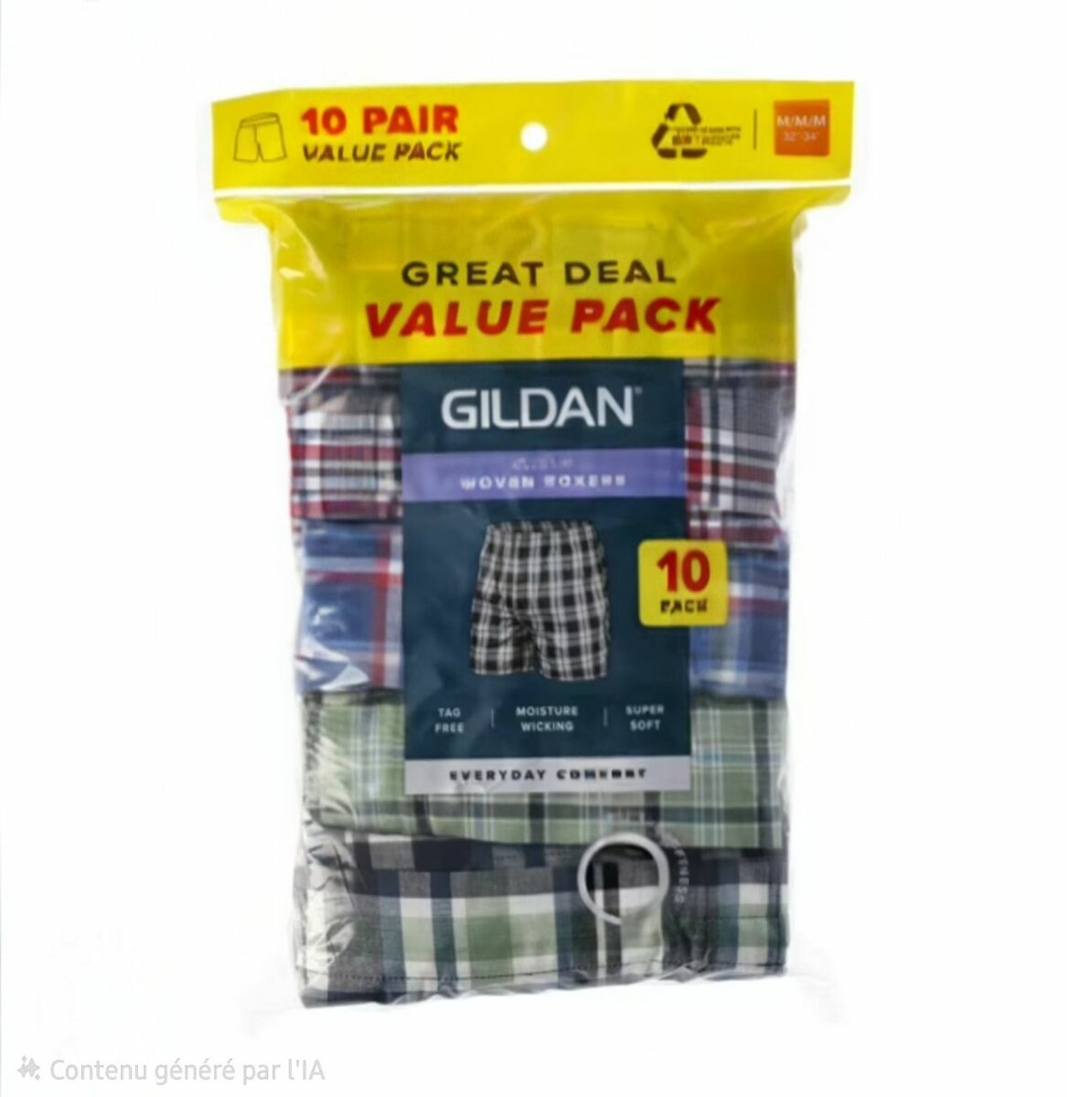 Lot de 10 boxers pour homme en coton Gildan. Confort et respirabilité garantis. Design épuré et moderne.