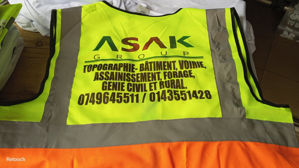 Gilet de sécurité ASAK Group, idéal pour travaux de construction et génie civil. Haute visibilité avec couleurs fluorescentes et bandes réfléchissantes pour une sécurité accrue. Parfait pour topographie, assainissement et forage.