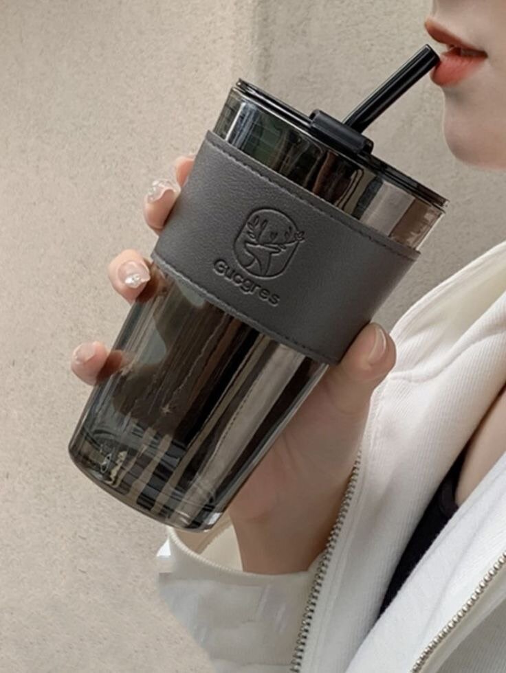 1pc Glass Cup With Straw, Lid and a Strap, about 450ml iced. Vintage Aesthetic Glass Tumbler
