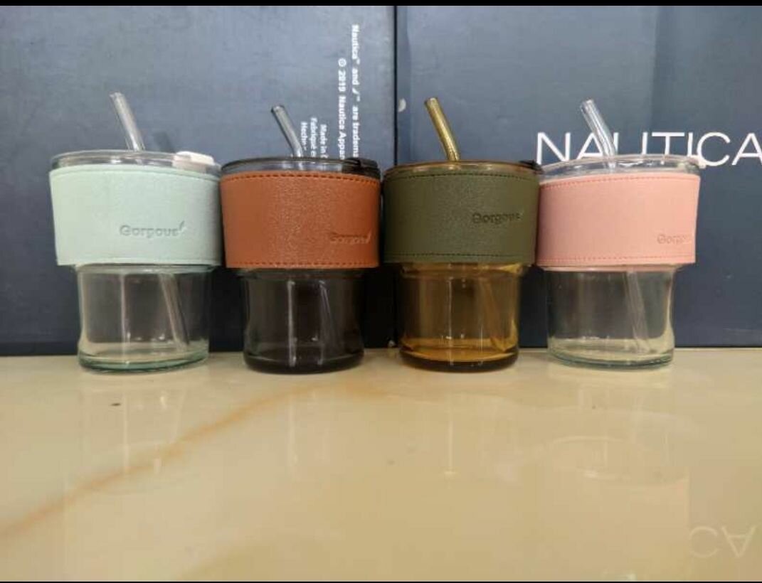 Tumbler comes with a glass straw in matching color. Available in pink, brown, blue and green
