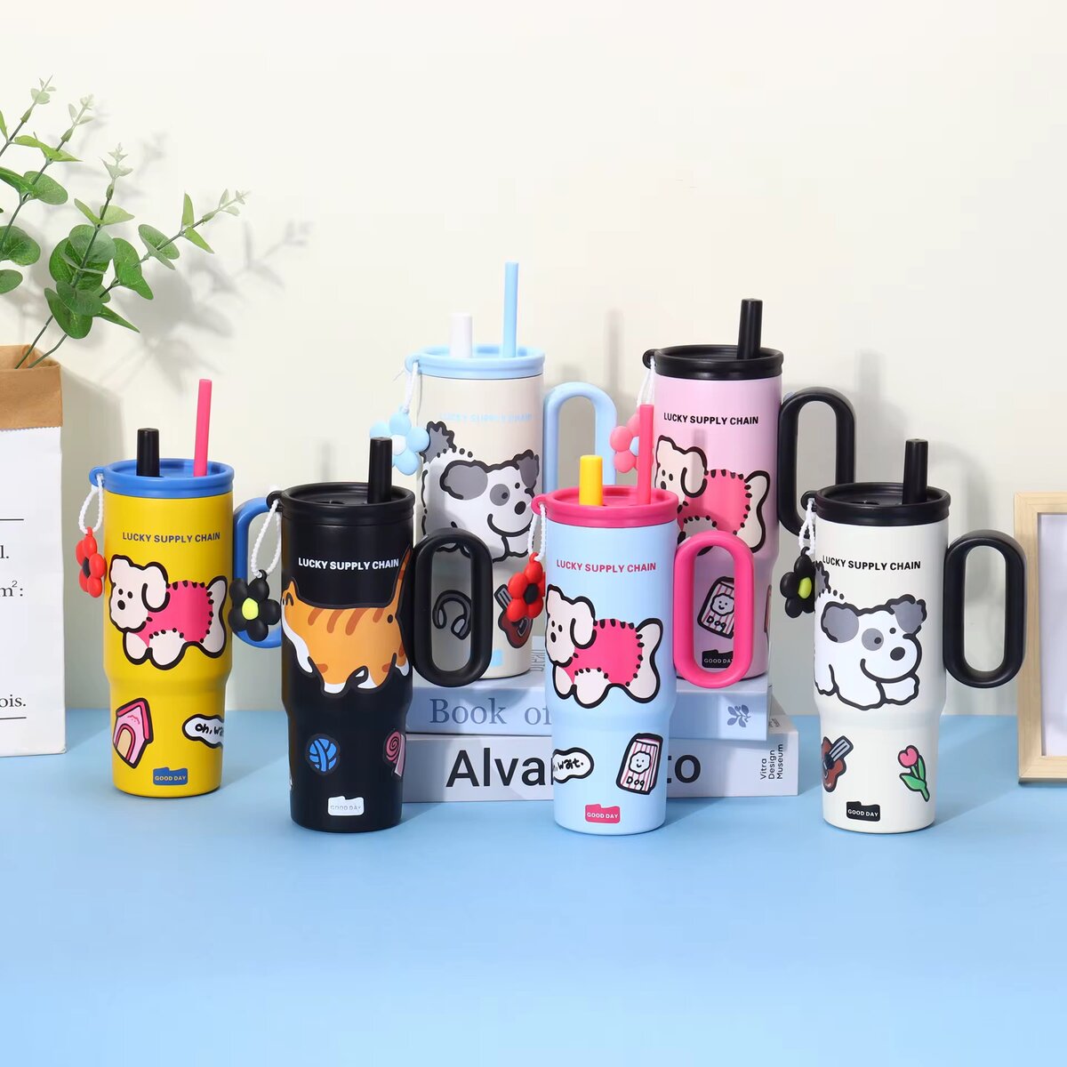 Gobelet isotherme avec poignée et paille, idéal pour les boissons chaudes ou froides. Design mignon avec motifs d'animaux, parfait pour les amateurs de café ou de thé.