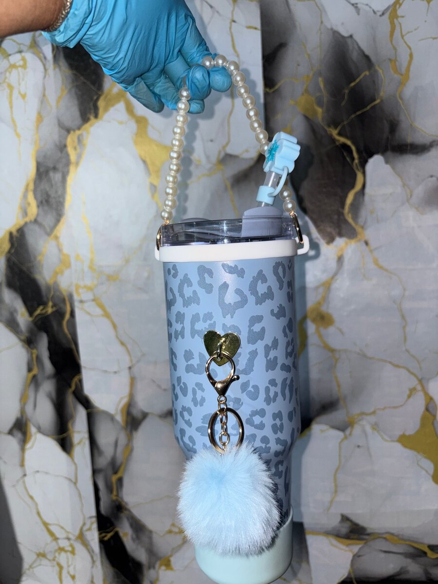 Gobelet isotherme motif léopard avec poignée en perles et pompon. Parfait pour garder vos boissons chaudes ou froides toute la journée.