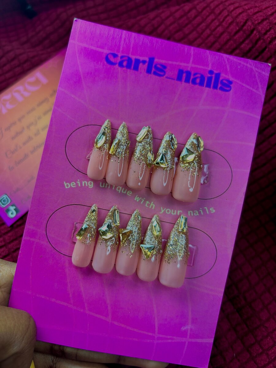 Ces press-on nails sont réutilisables , faits sur mesure et contient un kit de pose offert (2 colles, lime, alcool, repousse cuticules).