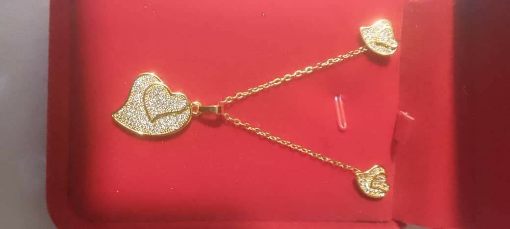 Elegant gold jewelry set featuring a heart-shaped pendant and matching earrings. Perfect for special occasions or everyday elegance. A dazzling addition to any outfit.