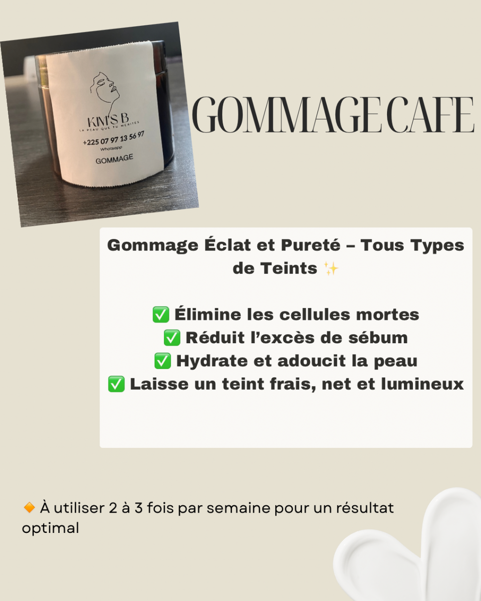 Redécouvrez l'éclat de votre peau avec notre Gommage Visage Café. Élimine les cellules mortes, réduit l'excès de sébum et hydrate en douceur. Idéal pour un teint frais et lumineux. Utilisez 2-3 fois par semaine pour un effet optimal. Convient à tous types de peaux.