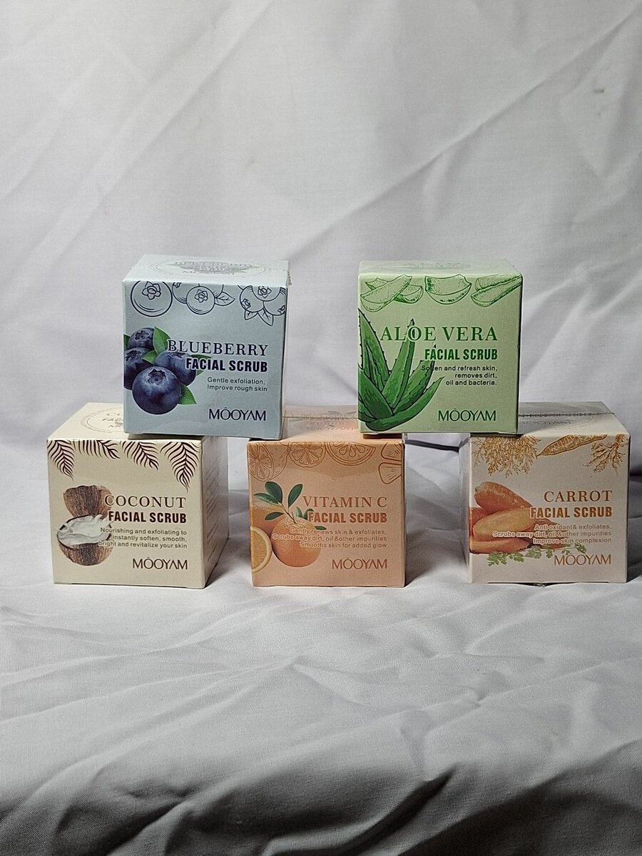 Découvrez les bienfaits du gommage visage MOOYAM, disponible en variantes myrtille, aloe vera, noix de coco, vitamine C et carotte. Exfoliation douce pour une peau éclatante et renouvelée. Idéal pour tous types de peau, ce gommage élimine les impuretés et stimule l'éclat naturel de votre teint.