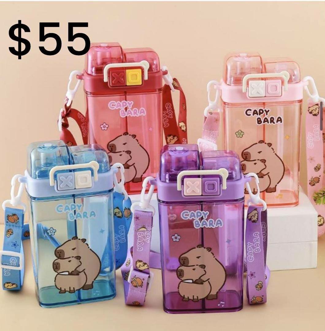 Gourde enfants avec motif capybara, disponible en plusieurs couleurs amusantes. Idéale pour l'école ou les sorties. Facile à transporter avec sa bandoulière réglable. Hydratez vos petits avec style !