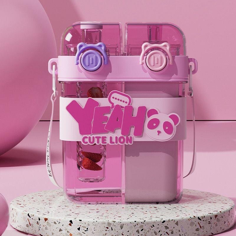 Gourde à double compartiment, parfaite pour mélanger boissons et friandises. Résistante et pratique avec paille intégrée. Idéale pour l'école ou le bureau.