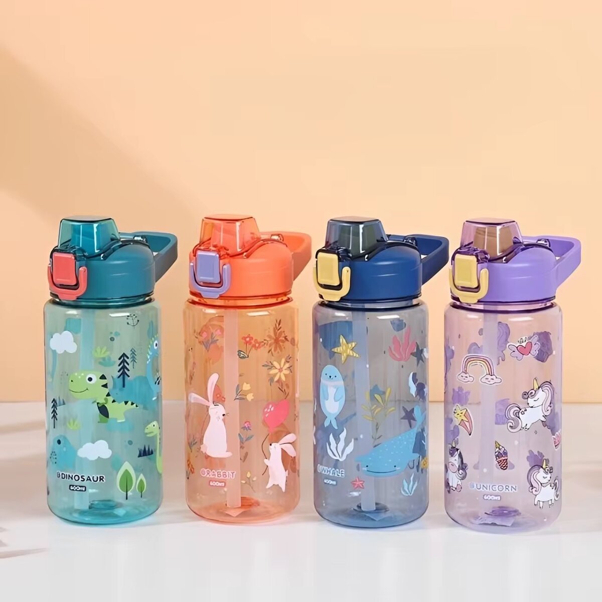 Gourde pour enfants de 350ml avec designs dinosaures, lapins, baleines et licornes. Fabriquée en plastique sans BPA, elle est idéale pour l'école et les sorties. Son système anti-fuite et son bec pratique assurent une hydratation facile et amusante pour vos petits aventuriers.