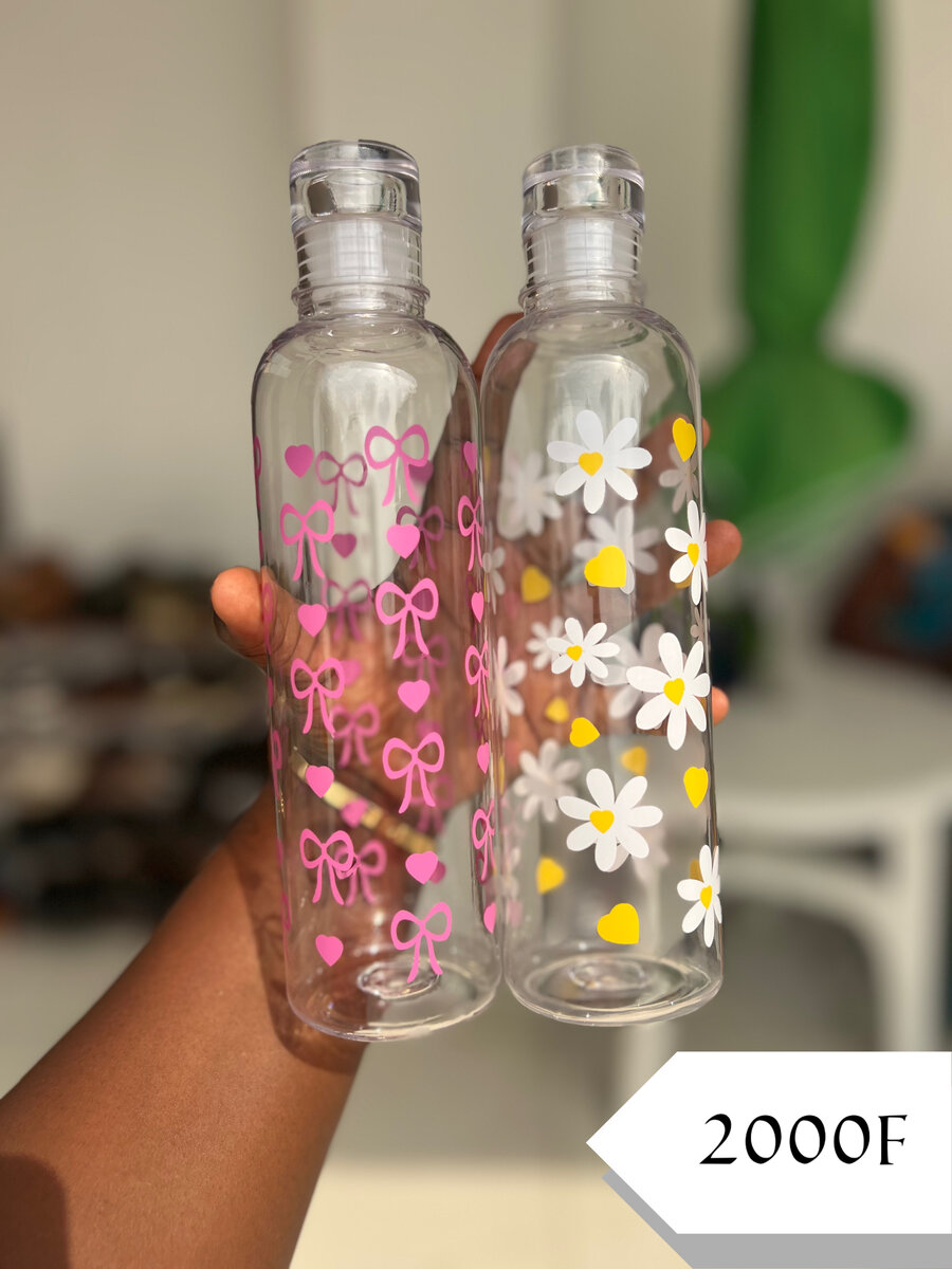 Bouteille en verre transparente avec motifs fleuris peints. Idéal pour contenir de l'eau ou des boissons. Léger et élégant, parfait pour un usage quotidien.