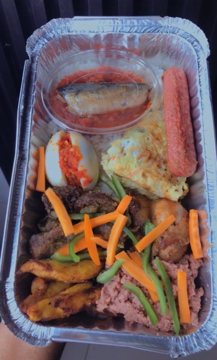 Fried egg, boiled egg with pepper , gizzard, sardine, con beef, turkey or goat meat , sausage