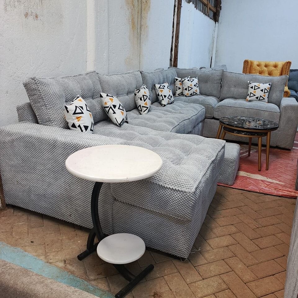 Ce grand canapé d'angle gris offre un confort absolu avec son tissu doux et ses coussins colorés. Idéal pour les salons modernes, il accueille toute la famille. Transformez votre espace avec style et élégance.