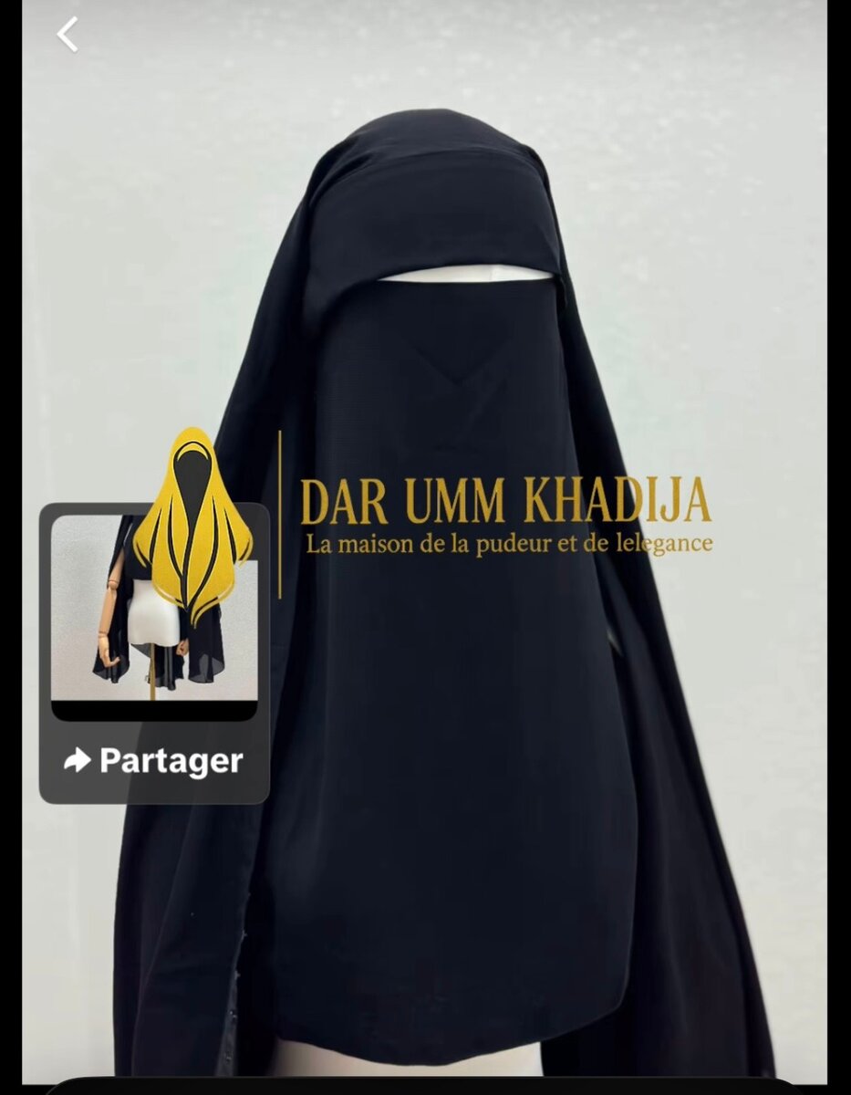 Niqab pour femme de marque DAR UMM KHADIJA, idéal pour les femmes musulmanes qui cherchent pudeur et élégance. Conçu pour offrir une couverture intégrale.