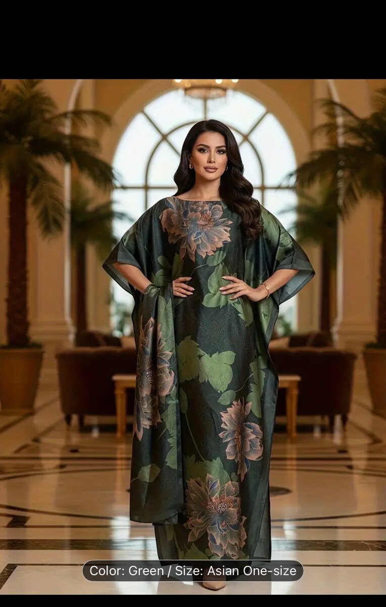 Elegant green floral kaftan dress with loose-fitting design. Perfect for beachwear or evening wear. One-size fits most. Made of comfortable, flowing fabric.