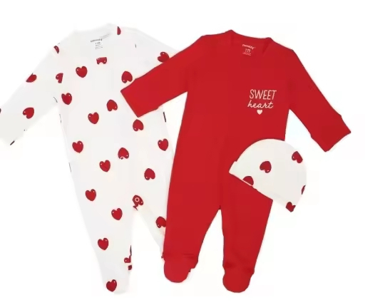 Pyjamas pour bébé en coton doux avec motifs cœur. Ensemble comprenant deux pyjamas et un bonnet assorti, parfaits pour le confort de votre petit. 0.3 & 3.6 mois