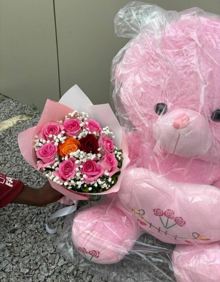 Ours en peluche rose avec bouquet de fleurs
