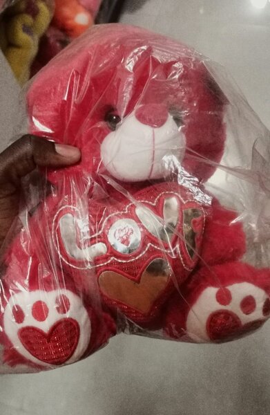 Un énorme ours en peluche rouge avec un nœud autour du cou. Idéal pour les enfants et les adultes qui aiment les peluches géantes. En peluche douce et confortable.