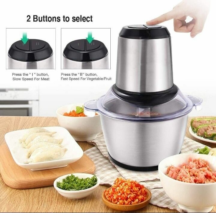 Hachoir électrique multifonction en inox pour viandes et légumes. Idéal pour la cuisine rapide et efficace. Deux vitesses pour hacher à votre convenance. Utile pour préparer des plats délicieux en un rien de temps.