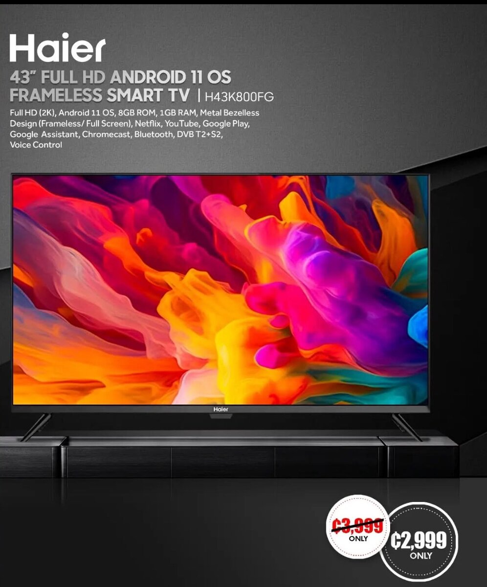 Full HD (2K), Android 11 OS, 8GB ROM, 1GB RAM, Metal Bezelless Design (Frameless/ Full Screen), Netflix, YouTube, Google Play, Google Assistant, Chromecast, Bluetooth, DVB T2+S2, Voice Control