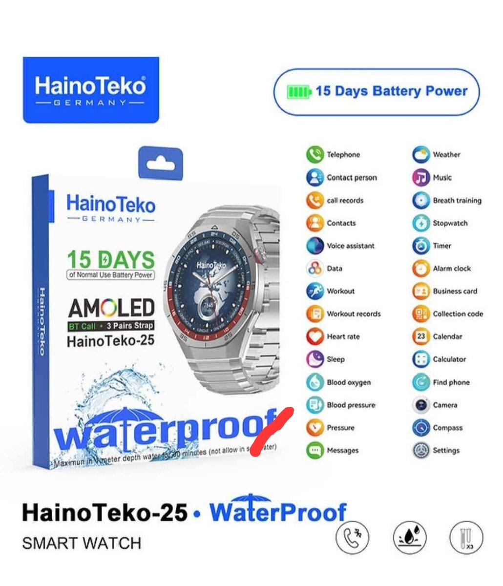 Découvrez la montre connectée HainoTeko-25, étanche et dotée d'une autonomie de 15 jours. Idéale pour le sport et le quotidien avec son écran AMOLED et ses multiples fonctions.