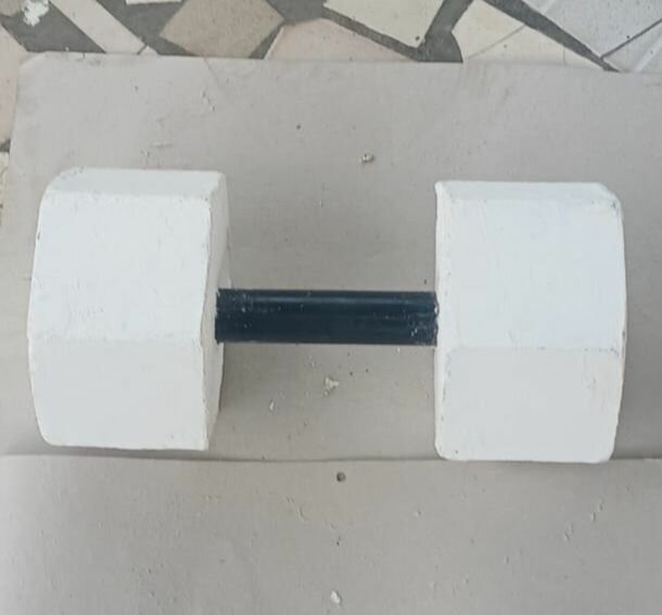 Haltère de musculation fait maison avec une barre noire et des extrémités en béton blanc. Idéal pour les entraînements de force et le fitness à domicile.