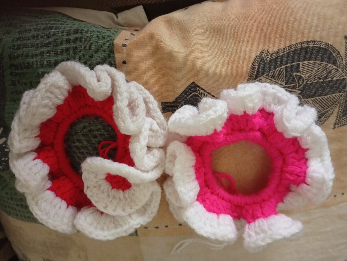 Vibrant crochet scrunchies with intricate ruffle design, perfect for adding a touch of creativity to your hairstyle. Ideal for casual and formal occasions, these scrunchies offer a gentle hold without damaging your hair.