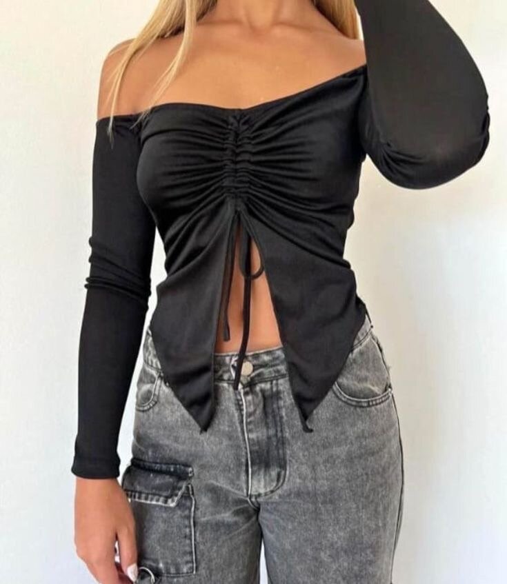 Découvrez notre haut noir à manches longues et épaules dénudées, idéal pour un look chic et sophistiqué. Sa coupe ajustée et ses détails subtils ajoutent une touche de glamour, parfait pour une sortie ou une soirée. Associez-le avec un jean ou une jupe pour une tenue complète et séduisante.