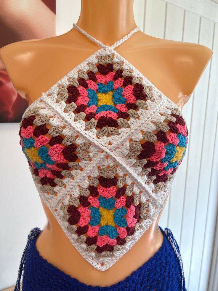 Disponible uniquement sur commande, Adoptez un style unique avec ce haut crochet fait à la main. Les motifs géométriques aux couleurs vibrantes apportent une touche bohème chic à votre garde-robe d'été. Parfait pour les festivals, la plage ou une journée ensoleillée. Fabriqué avec soin pour un confort optimal.