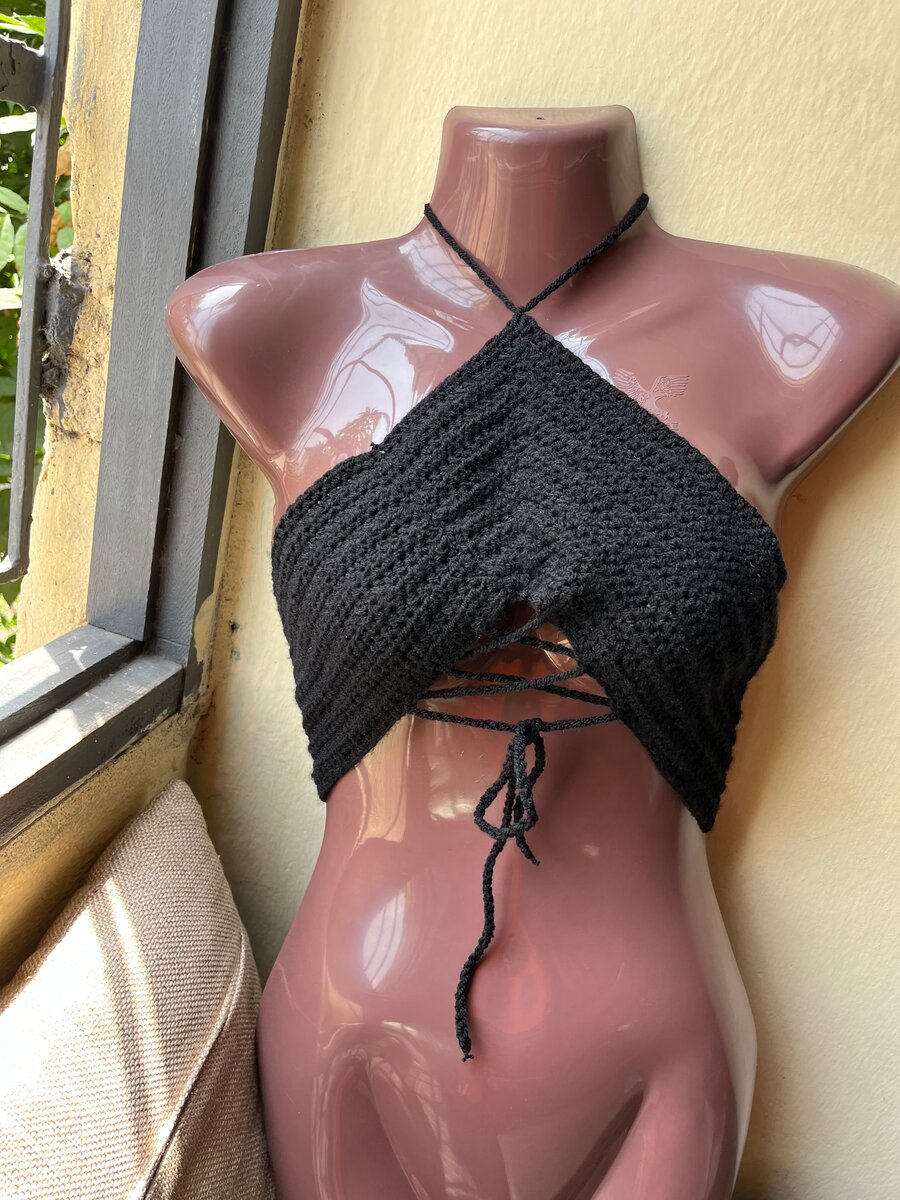 Haut de bikini noir tricoté avec des lacets. Parfait pour les vacances à la plage ou à la piscine. Confortable et élégant.