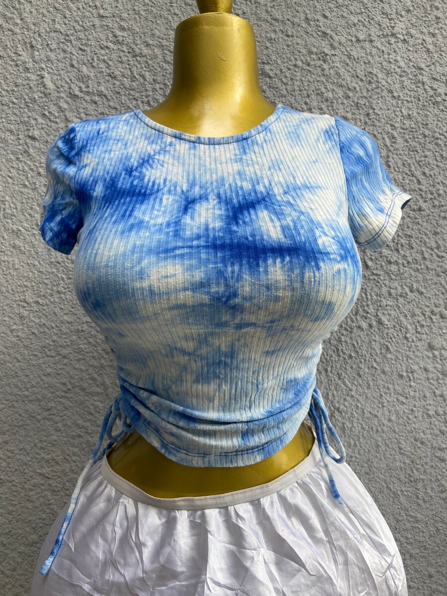 Ce haut femme bleu à cordons est parfait pour un look décontracté et tendance. Fabriqué dans un tissu doux et extensible, il offre un confort optimal. Avec son motif tie-dye et ses détails ajustables, il s'adapte à toutes les silhouettes. Idéal pour vos sorties en ville ou vos moments de détente. Faites sensation en toute simplicité!