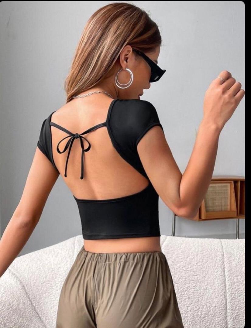 Découvrez ce haut noir élégant avec un dos ouvert et un lien subtil, parfait pour une soirée ou un événement spécial. Sa coupe moderne mettra en valeur votre silhouette, tout en apportant une touche chic à votre tenue. Idéal pour un look sophistiqué et tendance. Accordez-le avec une jupe ou un pantalon pour un style inoubliable.