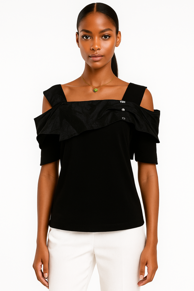 Haut élégant noir avec volants et épaules dénudées, parfait pour une tenue chic et moderne. Conçu pour offrir confort et style, idéal pour les soirées ou les occasions spéciales.