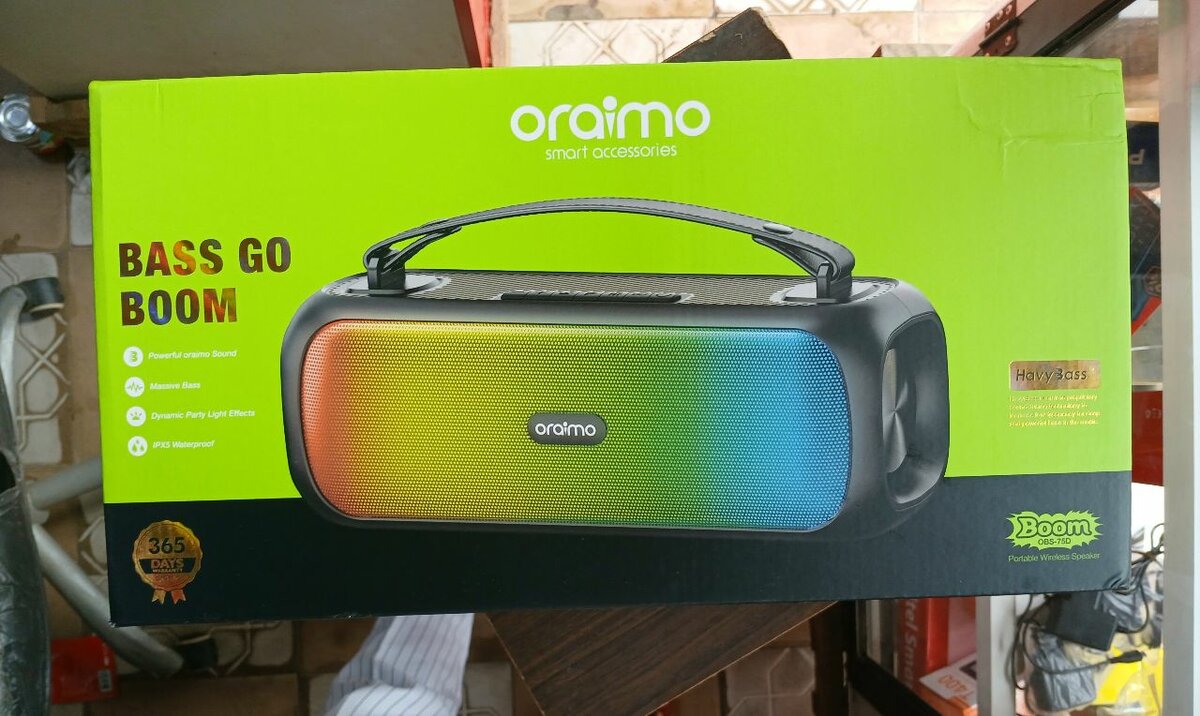 Découvrez le haut-parleur Oraimo Bass Boost pour un son puissant où que vous soyez. Avec ses lumières LED colorées et sa technologie Bluetooth avancée, il est parfait pour les fêtes en extérieur. Jouez vos playlists préférées jusqu'à 5 heures et profitez d'une expérience sonore exceptionnelle. Idéal pour les amateurs de musique en déplacement.
