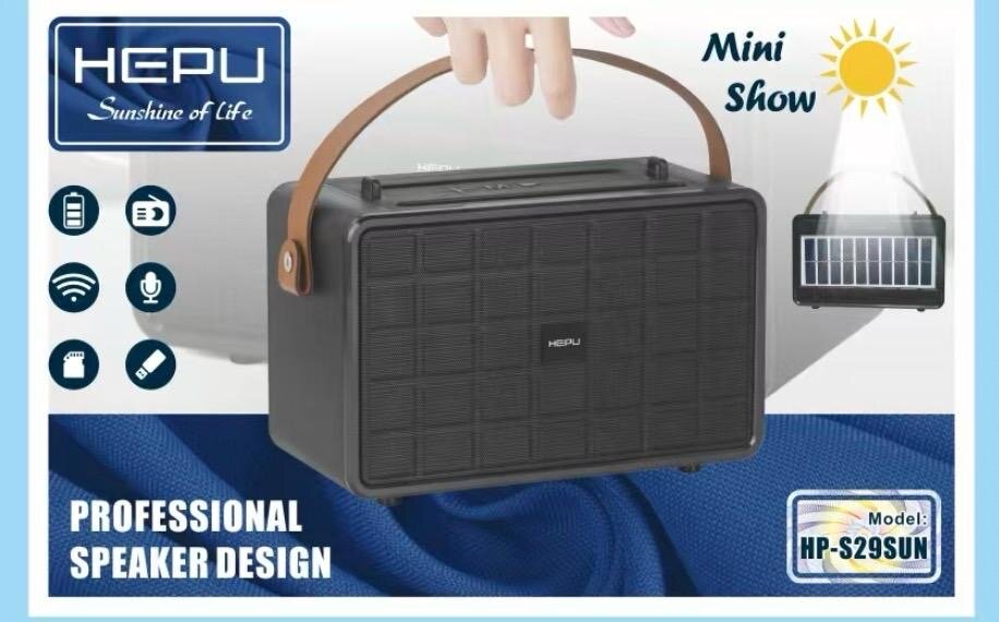 Découvrez le haut-parleur portable HEPU avec design professionnel. Équipé d'une poignée pour un transport facile et d'une fonction de charge solaire, c'est le compagnon idéal pour toutes vos sorties en plein air. Profitez d'un son clair et puissant tout en respectant l'environnement grâce à son alimentation solaire.